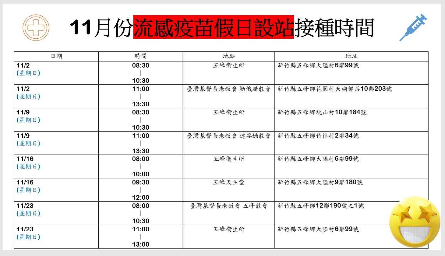 #成人流感接種時間為星期一至五上午9點到12點 #小兒流感接種時間為星期一及星期四上午9點到12點 #小兒流感請帶健保卡跟兒童健康手冊 #11月假日流感疫苗設站時間如照片檔 #如有疑問請來電03-5851005
