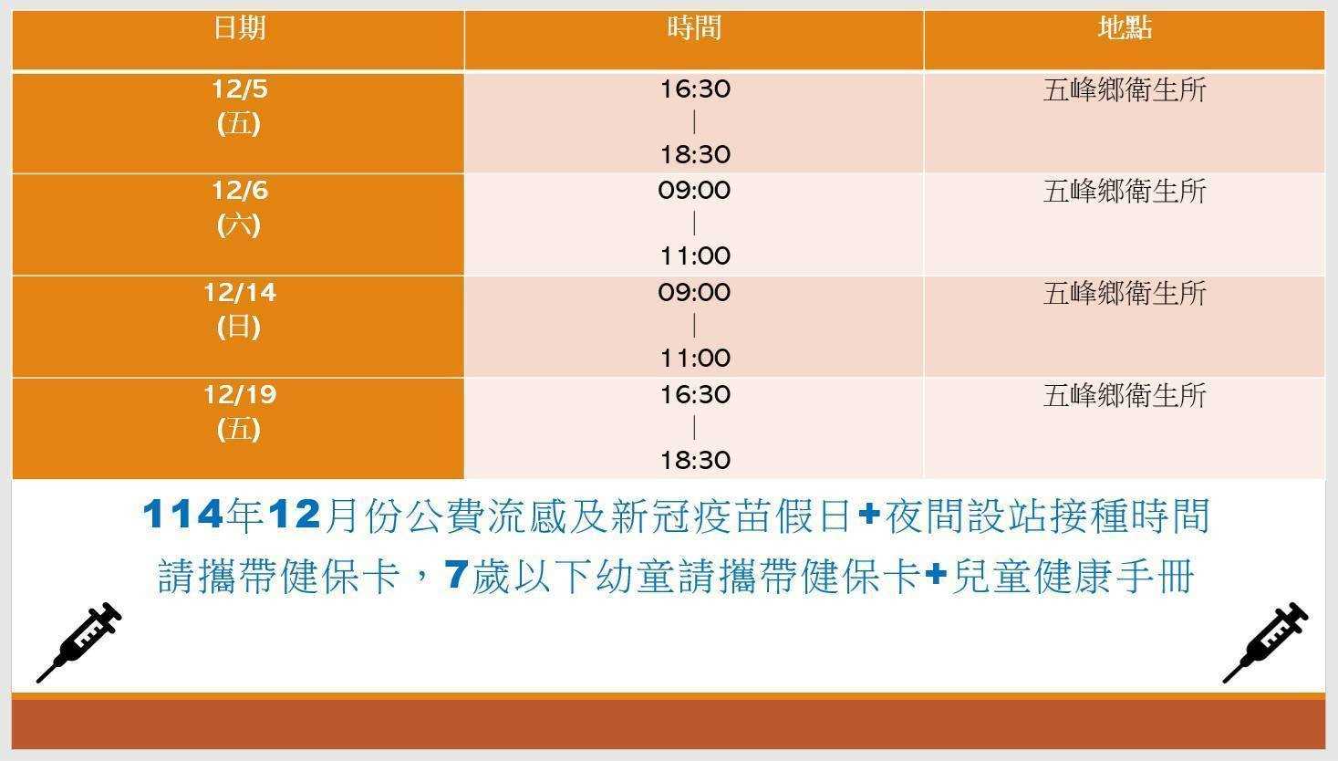 成人流感疫苗 星期一至星期五 上午09:00-12:00 小兒流感疫苗 星期一及星期四 上午:09:00-12:00 #請攜帶健保卡 #請攜帶兒童健康手冊 #如有疑問請來電03-5851005
