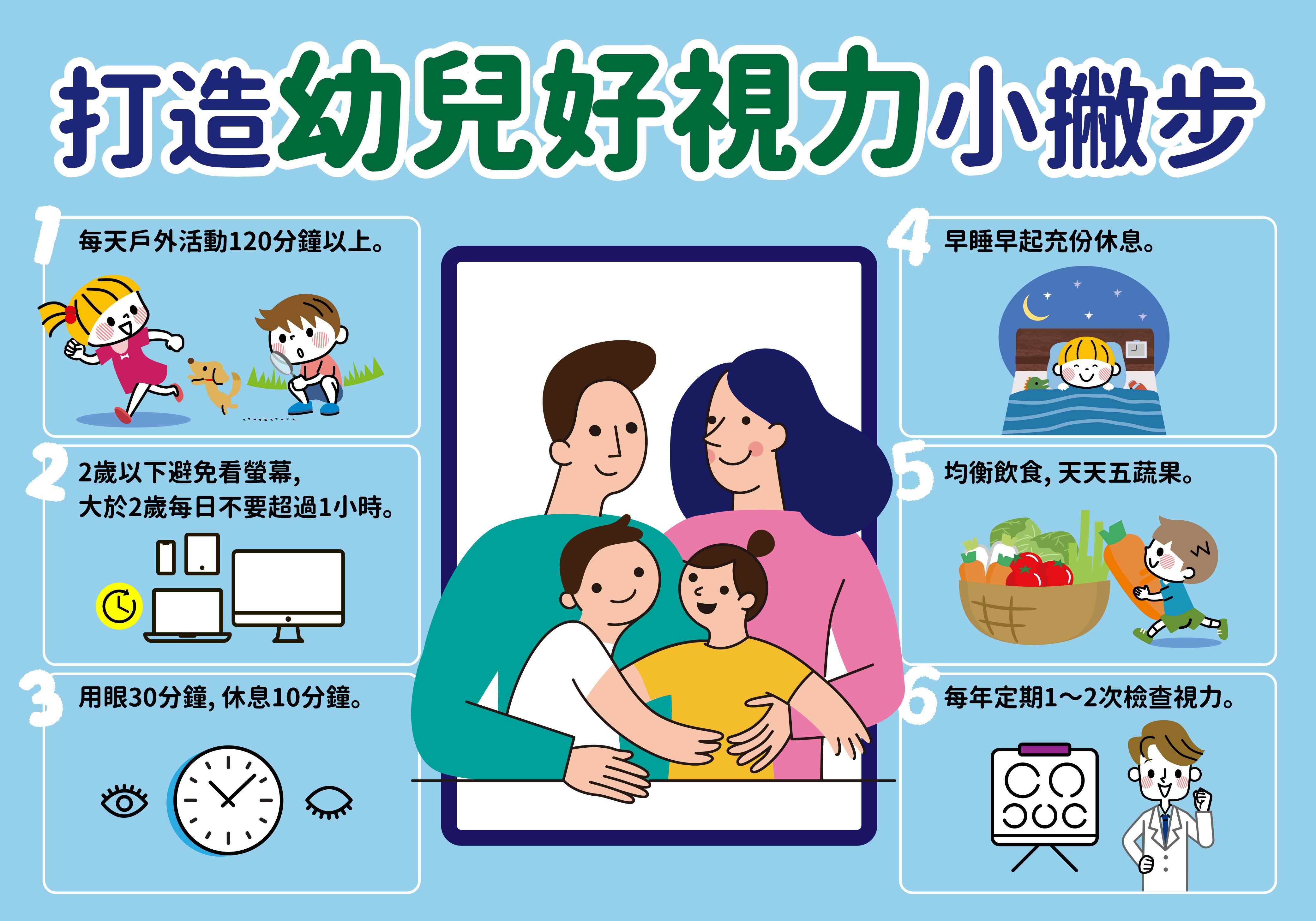 近視是疾病,由於學齡前期孩童的用眼習慣來自家長或照顧者(含保姆),為孩子建立近視防治的生活型態,從小即養成正確用眼的好習慣,國民健康署呼籲家長謹守eye眼6原則: